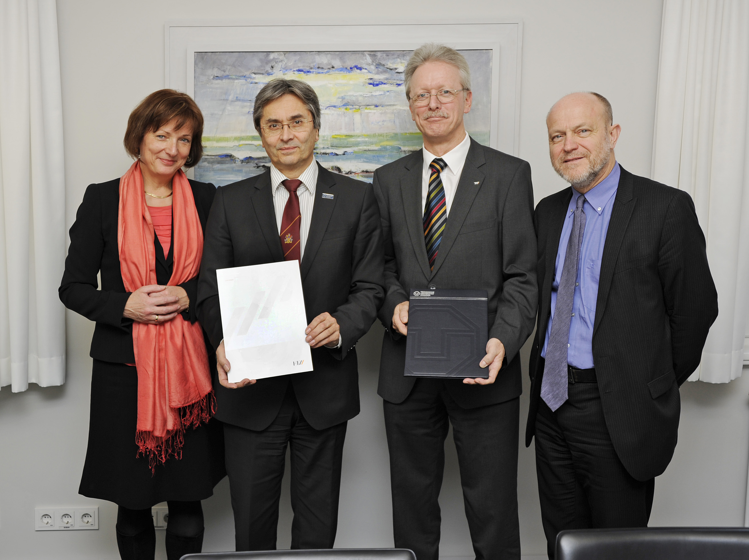 TUD und HTW wollen künftig noch enger kooperierenMit dem Ziel, die bewährten Profile beider Hochschulen in Lehre und Forschung weiter zu stärken, haben die Rektoren der TU Dresden (TUD), Prof. Hans Müller-Steinhagen, und der Hochschule für Technik und Wirtschaft Dresden (HTW), Prof. Roland Stenzel, einen entsprechenden Kooperationsvertrag unterzeichnet. Diese Kooperation folgt damit auch dem Anliegen des Hochschulentwicklungsplans des Freistaates Sachsen, die Synergien zwischen den einzelnen Hochschulen zu nutzen und den sächsischen Hochschulraum zu stärken. Der Rahmenkooperationsvertrag umfasst vor allem die Bereiche Forschung sowie Lehre und Studium und soll künftig auch auf die Felder Weiterbildung, Technologietransfer, Optimierung von Verwaltungsprozessen und weitere Bereiche ausgedehnt werden. Unter anderem soll Studierenden künftig der Wechsel zwischen den beiden Hochschulen erleichtert werden. Gleichzeitig eröffnet die Vereinbarung hervorragenden Absolventen der HTW eine abgestimmte Promotionsmöglichkeit an der TUD. Beide Hochschulen wollen mit der Kooperation ihre Attraktivität sowohl für Studierende als auch für Forschungspartner aus Wirtschaft und Gesellschaft weiter steigern. Foto (v.l.n.r.: Monika Niehues