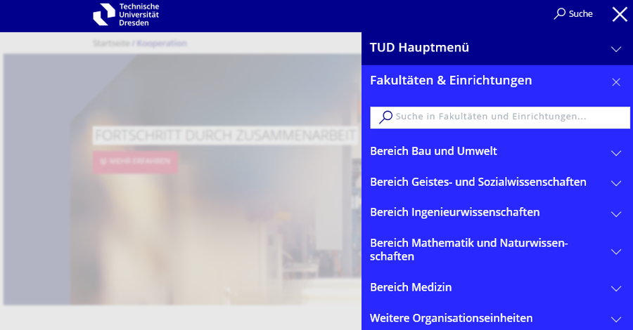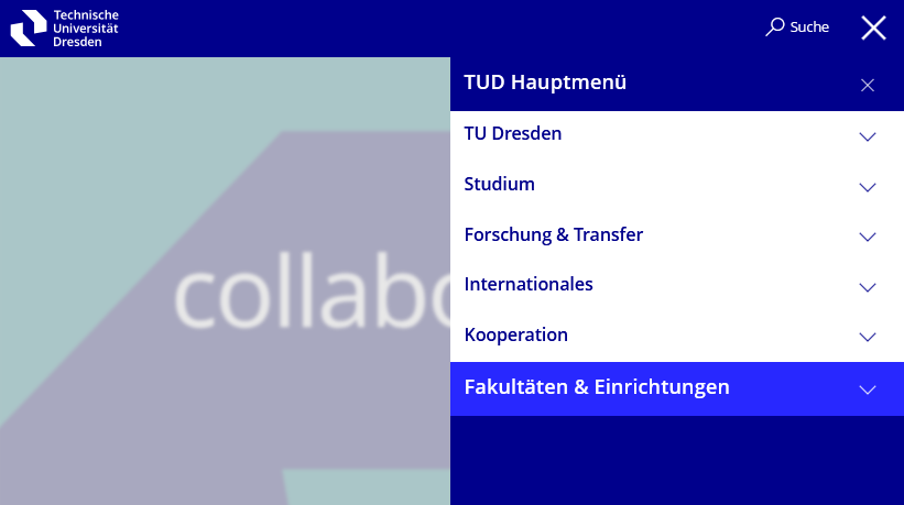 Hier finden Sie eine Navigation zu den Strukturen der TU Dresden. Die Übersicht öffnet sich wenn Sie auf „Fakultäten & Einrichtungen“ klicken.