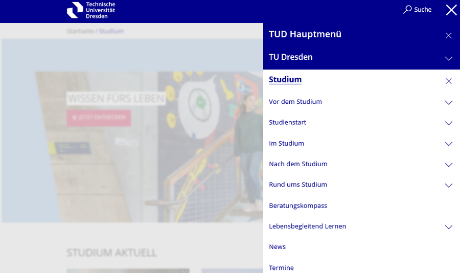 Auf unseren Seiten gibt es ganz oben einen blauen Balken. Links ist das Logo mit dem Schriftzug "Technische Universität Dresden" zu sehen. Sie können von jeder Unterseite darauf klicken, um zur Startseite zurückzukehren. Rechts sind mehrere Navigationselemente erreichbar: