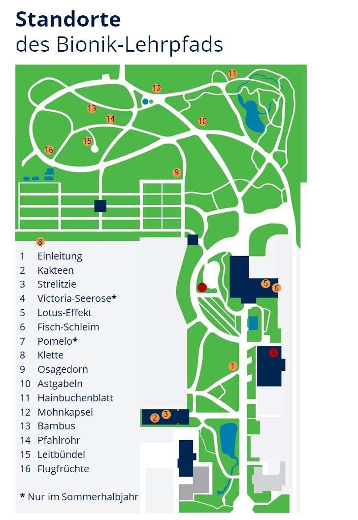 Auf einem Lehrpfad zum Thema „Bionik“ erfahren Sie, wie die Natur Wissenschaftler bei ihrer Suche nach Ideen für die Technik der Zukunft inspiriert. Der Lehrpfad beginnt etwa 60 Meter nach dem Eingang am Hauptweg (Übersichtsplan zum Bionik-Lehrpfad).