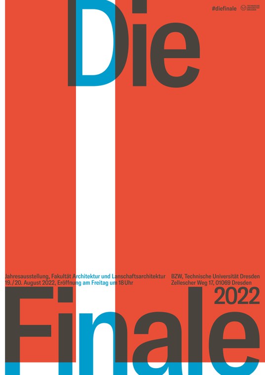 Am Freitag, den 19. und Samstag, den 20. August 2022 findet die Jahresausstellung die Finale der Fakultät Architektur und Landschaftsarchitektur der TU Dresden statt. BZW – Bürogebäude Zellescher Weg 17, 01069 Dresden.Die Eröffnung ist am Freitag, den 19. August um 18:00 Uhr. Im Anschluss wird es ein geführten Rundgang geben, live Musik, Getränke, Essen und eine Semesterabschlussparty, die vom FSR organisiert wird.