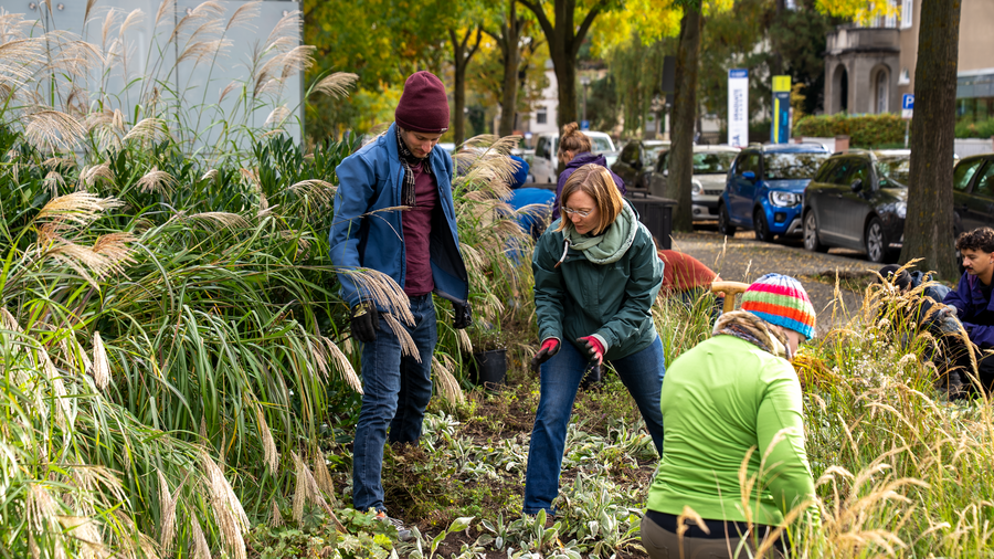 Da die aus der Pflege gefallenen Beete vor der Zeltmensa auf Dauer keinen Bestand haben, konnten wir die Pflanzen in eine Staudenfläche an der Mommsenstraße umsetzen. Unser "Pflanzplan" entstand dabei ad hoc in gemeinschaftlicher Aushandlung, da vorher nicht klar war, wie viele Pflanzen wir retten können - eine spannende Herausforderung!