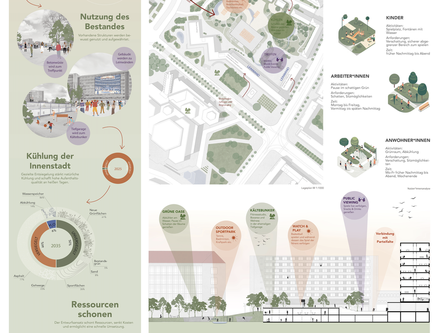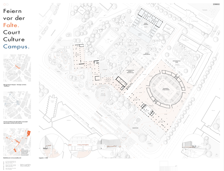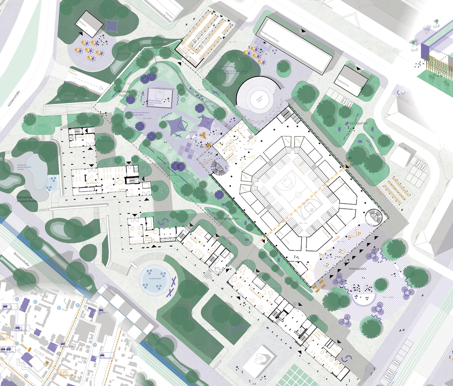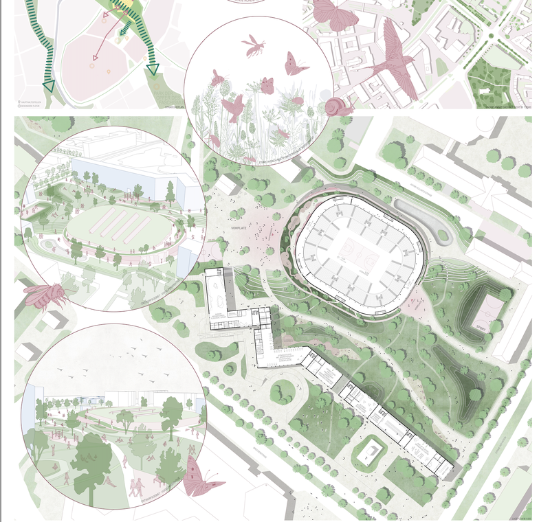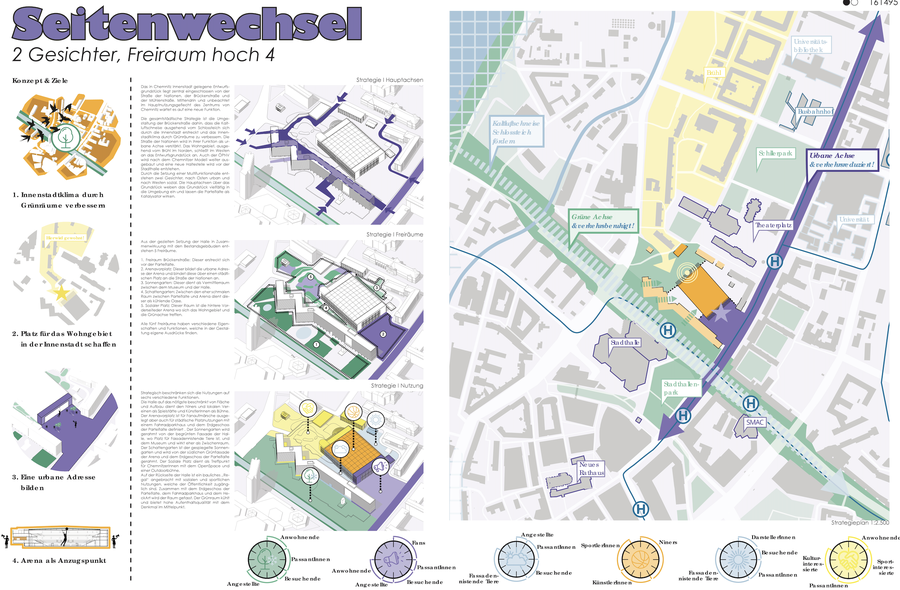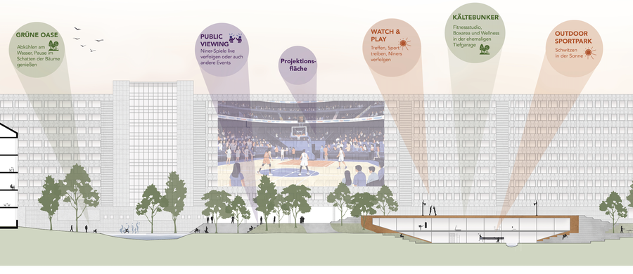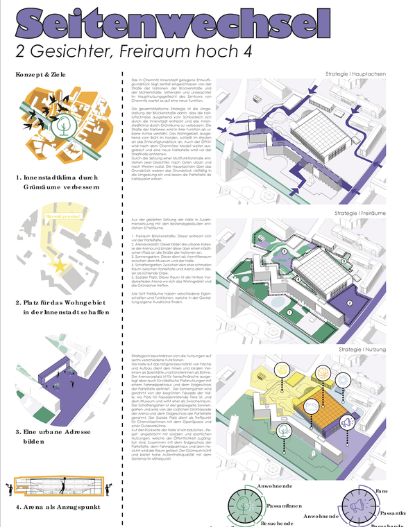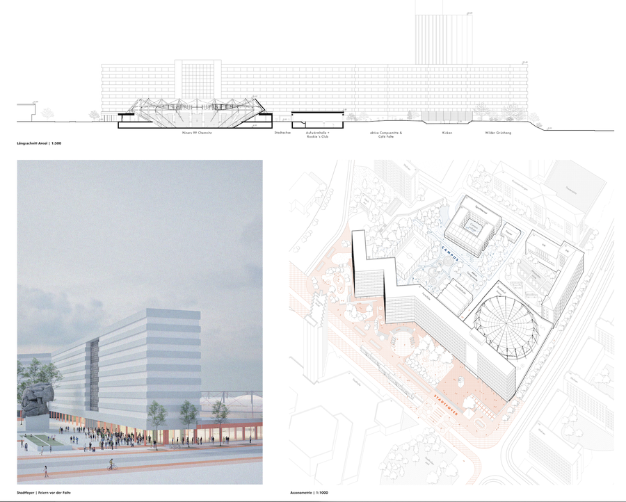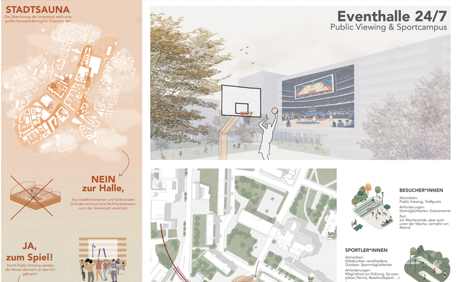 Neben dem Siegerentwurf, der eine Sporthalle im Zentrum von Chemnitz geschickt platzierte wurde auch ein Sonderpreis ausgezeichnet, der keine Bebauung vorsah. Insofern spiegelte die Entscheidung der Jury die aktuelle Debatte um die Bebaubarkeit von Innenstädten vor dem Hintergrund der Klimakrise wieder.