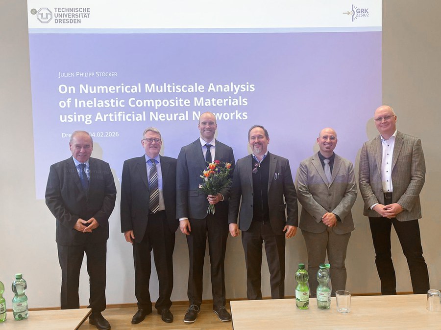 On 04.02.2026, Dipl.-Ing. Julien Philipp Stöcker successfully defended his scientific work as part of the doctoral procedure with the topic "On numerical multiscale analysis of inelastic composite materials by artificial neural networks". In addition to the chairman of the doctoral committee, Prof. Dr. Viktor Mechtcherine (TU Dresden), Prof. Dr. Michael Kaliske (TU Dresden), Prof. Dr. Fadi Aldakheel (Leibniz University Hannover) and Prof. Dr. Stefan Löhnert (TU Dresden) were present as reviewers. Prof. Dr. Wolfgang Graf (TU Dresden) was also present as a member of the doctoral committee. The faculty congratulates.