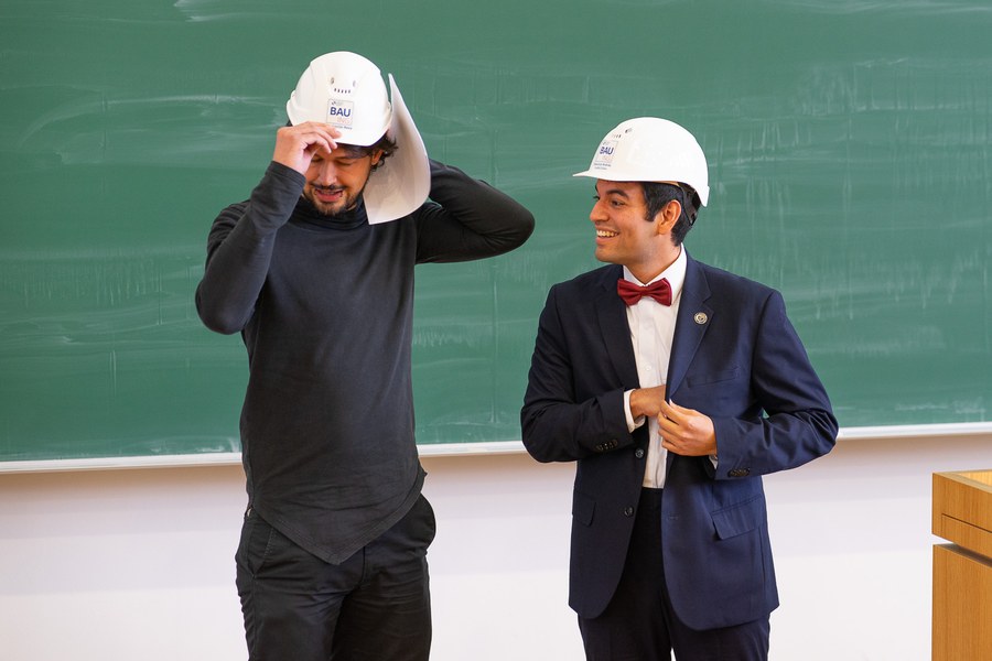 Als Vertreter der Absolventen auf der Bühne: Constantin Rexa und Dipl.-Ing. Francisco Andrés Avilés Calvo.
