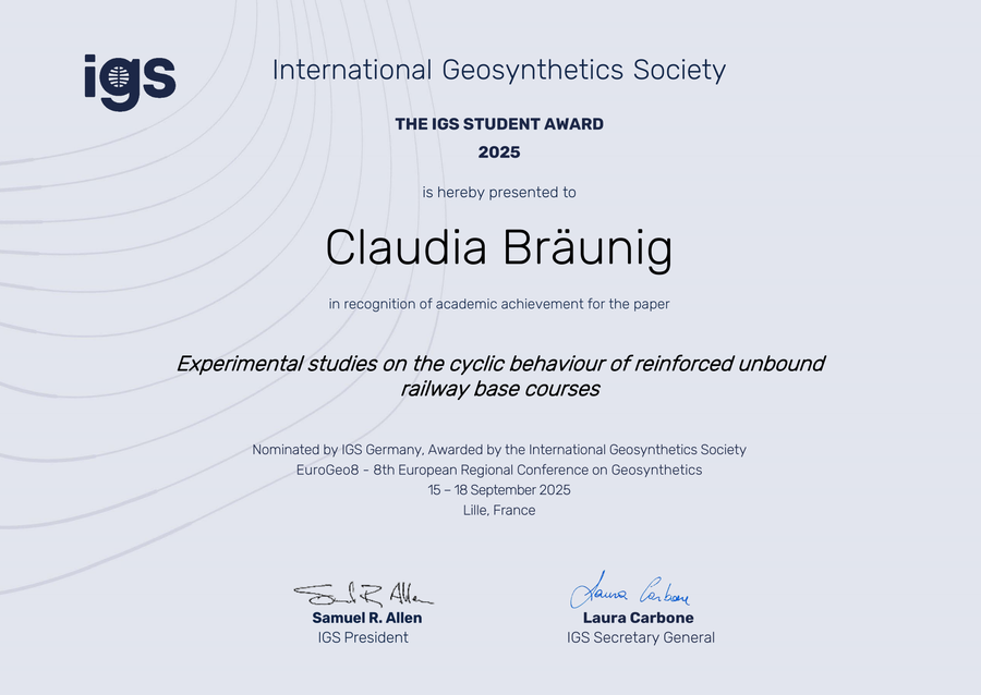 The IGS Student Award promotes young talents in the field of geosynthetics and related technologies. The aim is to disseminate knowledge and strengthen the exchange among young geotechnical engineers and geoscientists worldwide. In the current, ninth award period (2022-2025), the 2024 award for Europe was announced. The winners were invited to EuroGeo 8 in Lille (France), which took place from September 15-18, 2025. The IGS Student Award is provided by the International Geosynthetics Society.