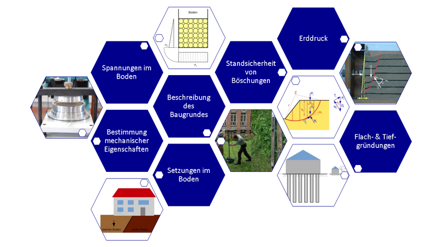 Das Modul UW-BHW-545 Bodenmechanik und Grundbau (Modulbeschreibung) schafft ein fundiertes Grundlagenwissen um das Verhalten von Böden einzuschätzen und bewerten zu können. Das Ziel ist es die Grundlagen der Geotechnik anschaulich zu vermitteln und den Baugrund zu verstehen. Dabei liegt der Fokus auf der direkten Anwendung der theoretischen Inhalte durch Übungsbeispiele und Laborübungen.