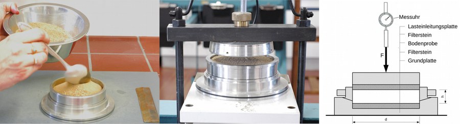 Ödometerversuch: Einbau des Bodens / Ödometertopf im Versuchsstand / Prinzipskizze