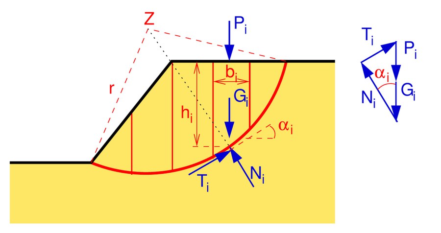 Potentieller Versagensmechanismus einer Böschung sowie haltende und treibende Kräfte an einer Lamelle.