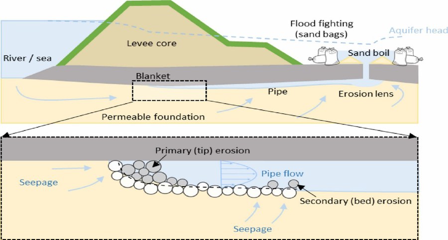 Visualisierung der primären und sekundären Erosionsprozesse im Deichquerschnitt © J. Pol / HKV Consultants