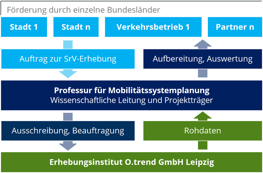 Bei den SrV-Erhebungen arbeiten Städte, Aufgabenträger, Verkehrsunternehmen und -verbünde sowie die Technische Universität Dresden und das jeweils für die Feldarbeit verantwortliche Erhebungsinstitut zusammen.