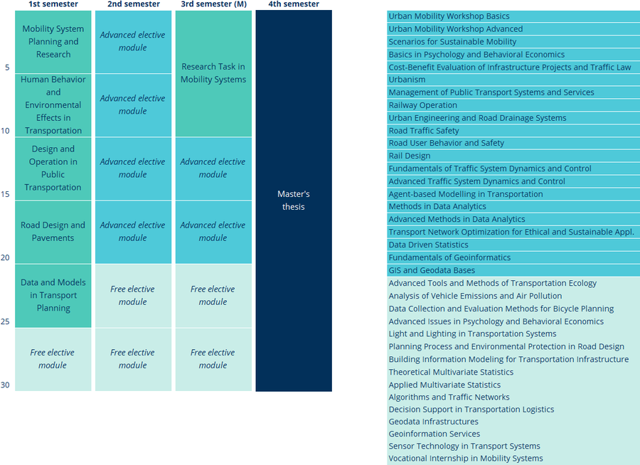 In einem umfangreichen Kern- und erweiterten Wahlpflichtbereich steht den Studierenden eine große Auswahl von Modulen aus den Verkehrswissenschaften sowie verwandter Disziplinen zur Verfügung. Dies beinhaltet u. a. methodische Kompetenzen in den Datenwissenschaften, Statistik, Modellierung, Geoinformationssystemen, Umweltwissenschaften sowie vertiefte verkehrswissen-schaftliche Kompetenzen, u. a. in der Gestaltung von Infrastrukturen und Verkehrsangeboten im Straßen-, Schienen- und Luftverkehr, im Mobilitäts- und Verkehrsmanagement, in der Gestaltung von Intelligenten Transportsystemen (ITS) unter Berücksichtigung von Dynamiken der Automatisierung, Digitalisierung und stärkeren Vernetzung von Verkehrsangeboten sowie weiterer ergän-zender interdisziplinärer Themenbereiche.