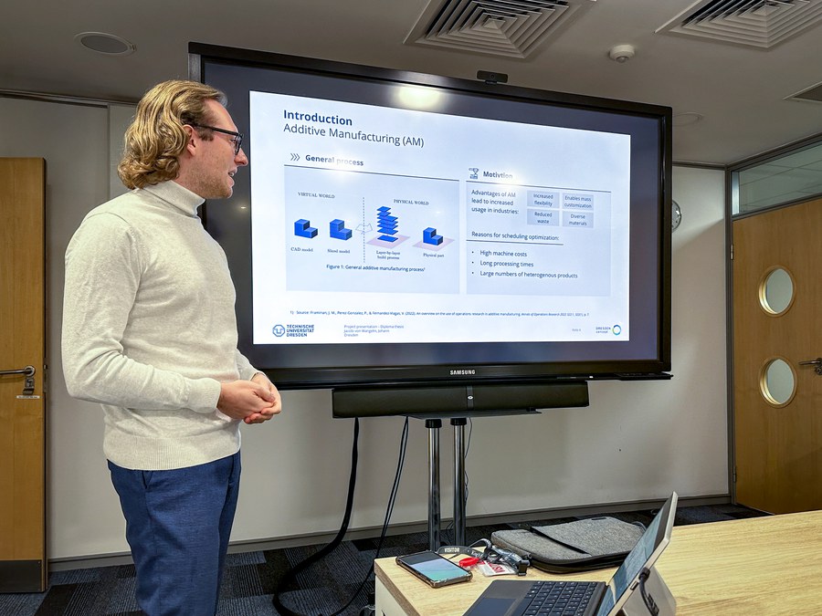 Im Rahmen einer Kooperation derProfessur für BWL, insbesondere Industrielles Management, konnte Herr Johann Jacobi von Wangelin für eine Woche am King’s College London mit Prof. Dr. Rym M’Hallah zusammenarbeiten. Der Aufenthalt diente dem wissenschaftlichen Austausch zu seiner Diplomarbeit mit dem Thema „Solution approaches for scheduling in additive manufacturing with decomposition and post-processing“.