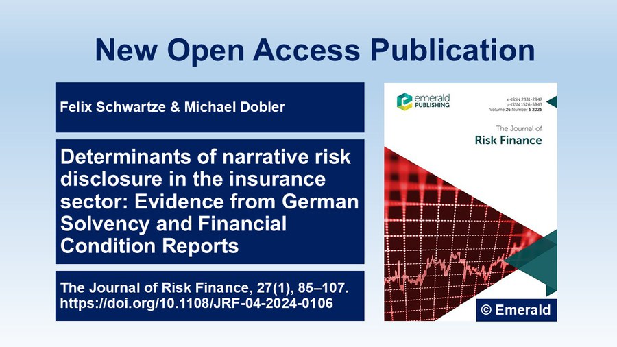 In ihrem jüngst in The Journal of Risk Finance veröffentlichten Beitrag widmen sich Felix Schwartze und Michael Dobler (Professur für BWL, insb. Wirtschaftsprüfung und Steuerlehre) den Determinanten der Berichterstattung von deutschen Versicherungsunternehmen über Risiken und deren Management. Anders als bisherige empirische Untersuchungen in der Versicherungsbranche analysieren sie dazu die Risikoberichterstattung in den Solvency and Financial Condition Reports (SFCRs) von überwiegend nicht-kapitalmarktorientierten Versicherern. Die Befunde legen mithin nahe, dass sozio-politische Theorien das Ausmaß der Risikoberichterstattung erklären können und verdeutlichen die Bedeutung von Publizitätsanreizen selbst in einem stark regulierten Umfeld.