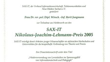- Nikolaus-Joachim-Lehmann-Preis 2005 für die Dissertation von Frau Dr. Jungmann