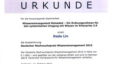 - Deutscher Nachwuchspreis Wissensmanagement 2010 für die Diplomarbeit von Herrn Dipl.-Wirt.-Ing. Lin