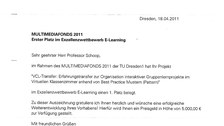 - 1. Platz im Exzellenzwettbewerb E-Learning des Multimediafonds der TU Dresden 2011 für das Projekt VCL-Transfer