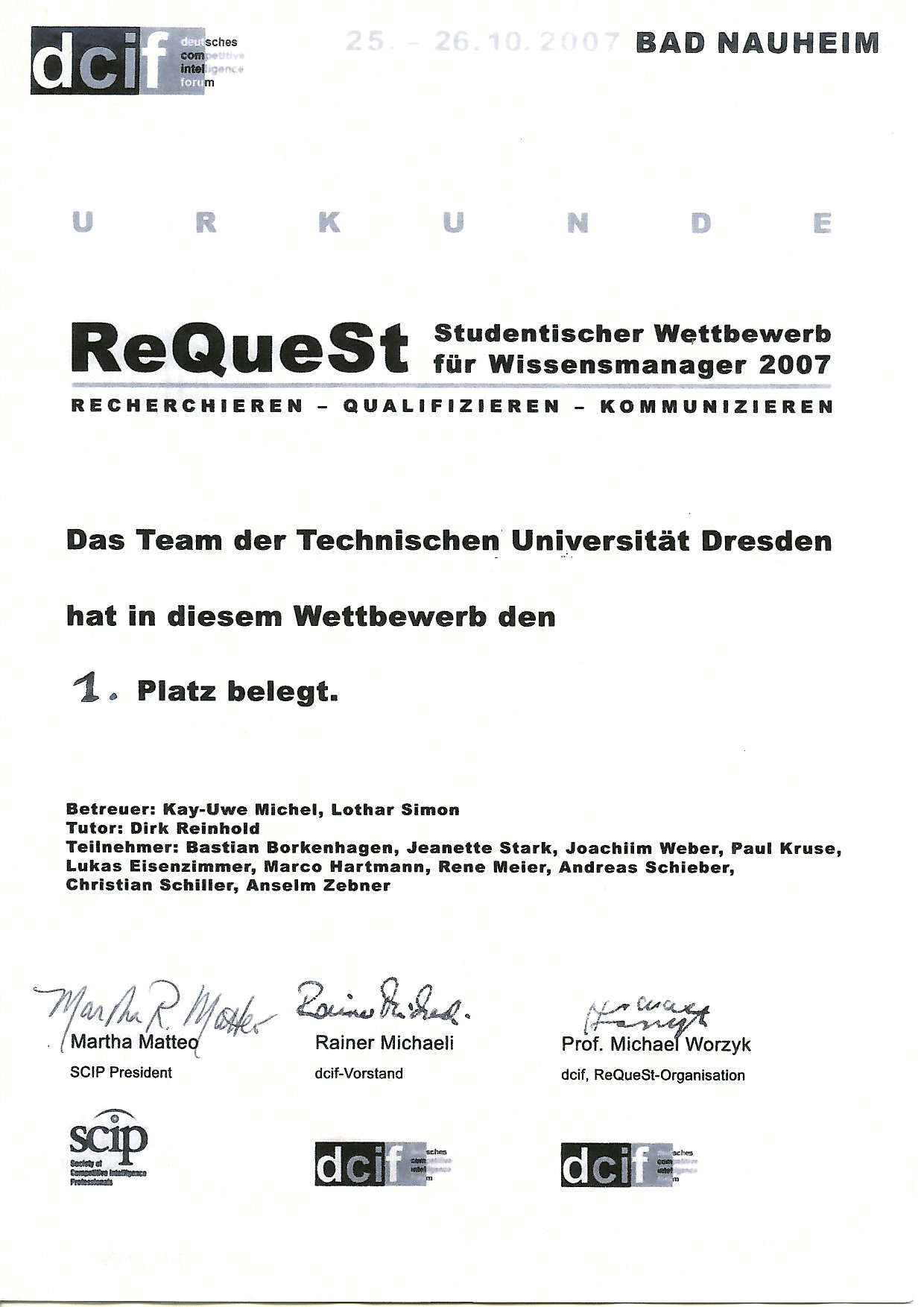 - 1. Platz im Studentischen Wettbewerb für Wissensmanager 2007 (ReQueSt)