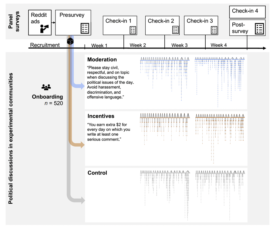 The team ran a collective field experiment on Reddit. Over four weeks, 520 participants discussed 20 political issues in six private communities. The study tested how monetary incentives and moderation prompts shape participation and discourse quality.