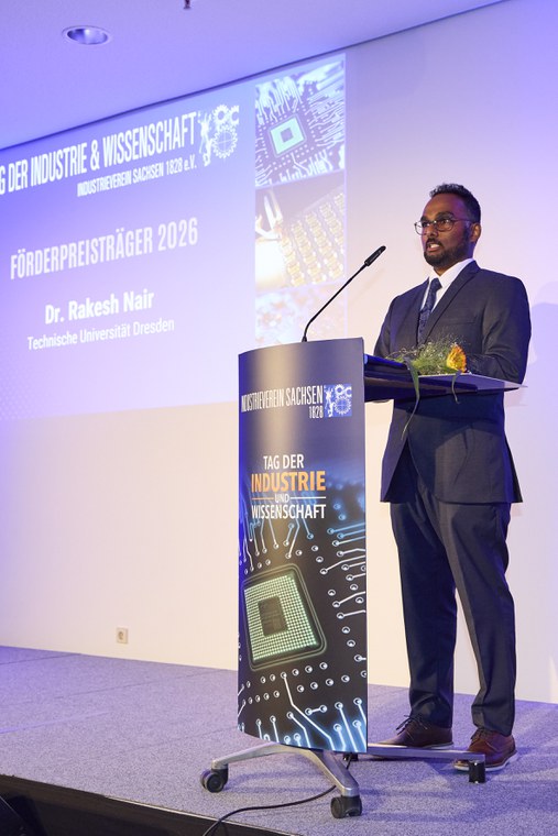 Dr. Rakesh Nair vom Institut für Angewandte Physik der Technischen Universität Dresden wurde mit dem Förderpreis „Richard Hartmann“ des Industrievereins Sachsen 1828 e.V. für seine wegweisenden Arbeiten zur Entwicklung nachhaltiger, biologisch abbaubarer Elektronik auf Basis natürlicher Lignocellulose-Strukturen ausgezeichnet. Die Preisverleihung fand im Rahmen einer Festveranstaltung zum Tag der Industrie & Wissenschaft, am 23. Februar 2026 bei Infineon Technologies Dresden AG & Co. KG statt.