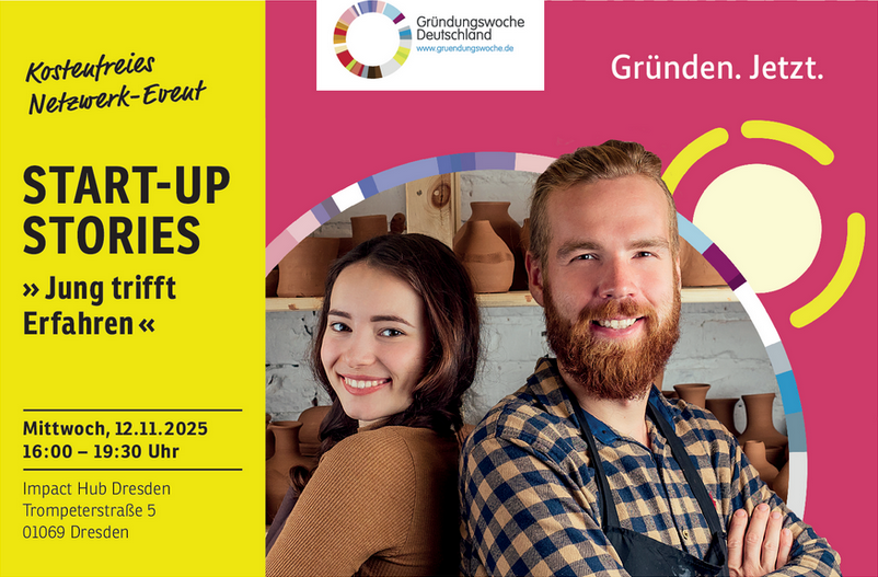 Anlässlich der Gründungswoche Deutschland 2025 lädt die Stadt Dresden gemeinsam mit dresden|exists und weiteren Partnern Gründungsinteressierte und Gründer:innen ins Impact Hub Dresden ein. Unter dem Motto „Startup Stories – Jung trifft Erfahren“ berichten Startups über ihren Weg von der Idee zum Unternehmen.