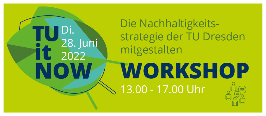Gestalten und denken Sie mit im Workshop „TU it NOW – Die Nachhaltigkeitsstrategie der TU Dresden mitgestalten“ am 28.6.2022, 13-17 Uhr im Dülfer-Saal (Alte Mensa)!