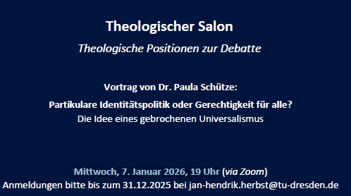 Am Mittwoch, 7. Januar 2026, um 19 Uhr findet der "Theologische Salon - Theologische Positionen zur Debatte" mit Dr. Paula Schütze (TU Dortmund) statt. Das Thema ist: "Partikulare Identitätspolitik oder Gerechtigkeit für alle? Die Idee eines gebrochenen Universalismus". Herzliche Einladung!