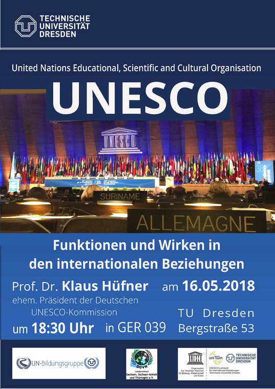 am 16.05.2018 hält Prof. Dr. Klaus Hüfner, ehem. Präsident der Deutschen UNESCO-Kommission, einen Vortrag zum Thema "Die United Nations Educational, Scientific and Cultural Organisation (UNESCO): Funktionen und Wirken in den internationalen Beziehungen".