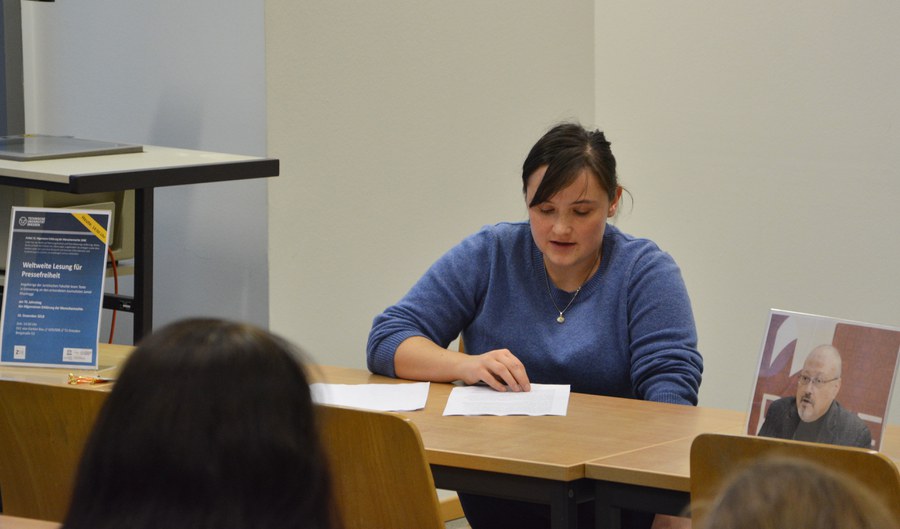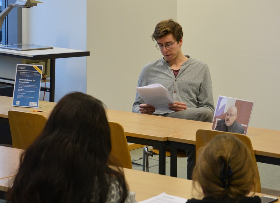 Am 10. Dezember 2018 lasen Angehörige der Juristischen Fakultät Texte von und über Jamal Khashoggi in Erinnerung an den ermordeten saudischen Journalisten anlässlich der weltweiten Lesung für Pressefreiheit am 70. Jahrestag der Erklärung der Menschenrechte.