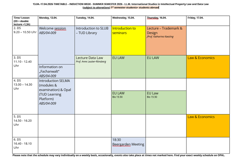 In der ersten Vorlesungswoche bieten wir Einführungsveranstaltungen zum Umgang mit dem Lernportal, zur juristischen Recherche, dem Europarecht als essentielle Voraussetzung für die weiteren Veranstaltungen während des Semesters. Erste inhaltliche Veranstaltungen fehlen natürlich auch nicht. Daneben stehen aber auch außeruniversitäre Veranstaltungen auf dem Programm. Detaillierte Informationen zur Orientierungswoche und zum restlichen Stundenplan können Sie dem TU-internen Online Lernportal OPAL (ZIH-Login-Daten notwendig) entnehmen.