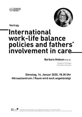 Am Di, 14.01.2020 um 18:30 hält Frau Prof. Dr. Barbara Hobson (Institute of Sociology, Stockholm University) einen Vortrag zum Thema "International work-life balance policies and fathers' involvement in care" im Hörsaalzentrum HSZ Raum 304.
