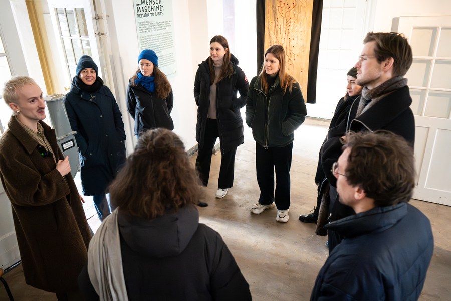 Im Zentrum unseres Besuchs stand die Ausstellung „Mensch Maschine: Return to Earth“. Während einer Führung von Niels Boogers durch das historische Gebäude erhielten wir Einblick in künstlerische Arbeiten, die im Rahmen der dort ansässigen Residencies entstanden sind. Die künstlerischen Positionen verhandeln diese Beziehung vor dem Hintergrund von Klimakrise, Digitalisierung und Künstlicher Intelligenz – und erweitern diese Perspektive auf nichtmenschliche Lebewesen und planetare Systeme.
