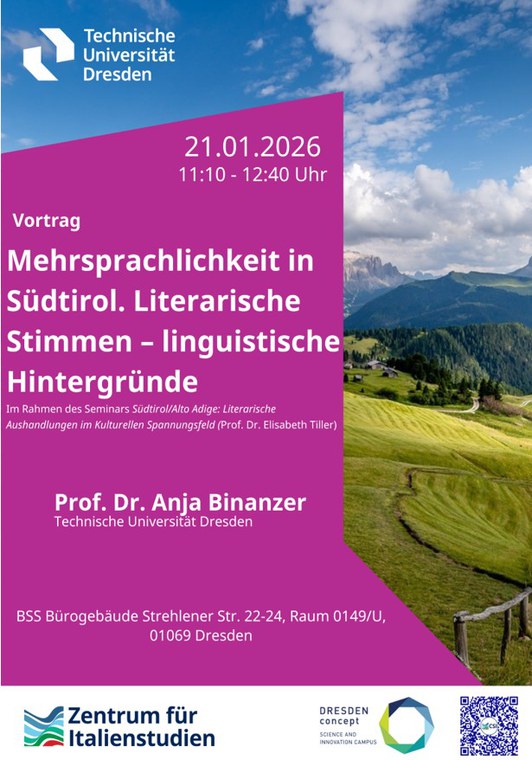 Wir laden Sie herzlich zum Vortrag von Prof. Dr. Anja Binanzer (TU Dresden) mit dem Titel: "Mehrsprachigkeit in Südtirol. Literarische Stimmen – linguistische Hintergründe".