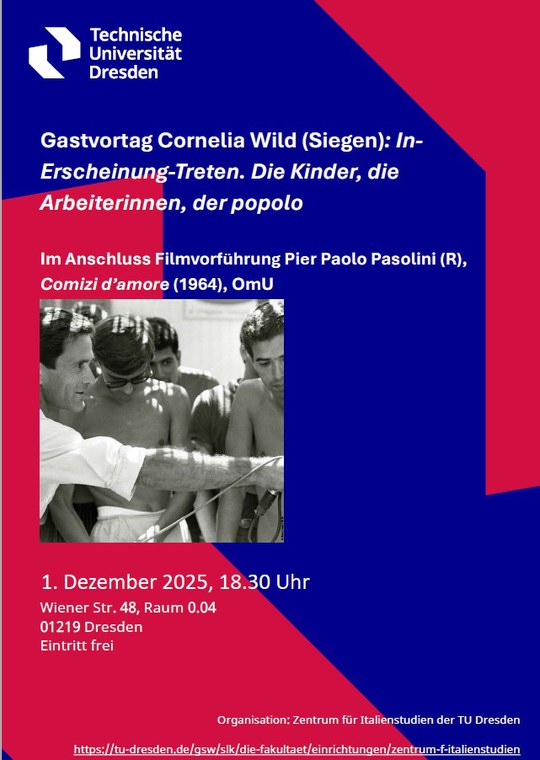 Das Zentrum für Italienstudien lädt Sie herzlich zur zweiten Veranstaltung der Reihe „Rom und Italien bei Pasolini / Roma e l'Italia di Pasolini. Filmreihe mit Vorträgen und Diskussionen“ ein.