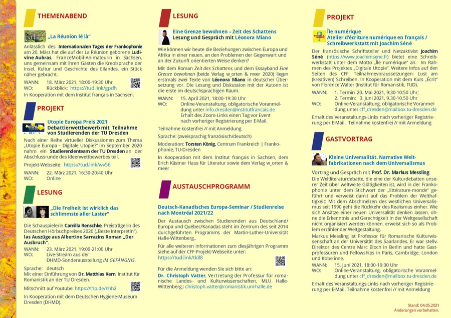 - Wo: Online-Veranstaltung, obligatorische Voranmeldung unter info.dresden[at]institutfrancais.de; Erhalt des Zoom-Links einen Tag vor Event nach vorheriger Registrierung per E-Mail.