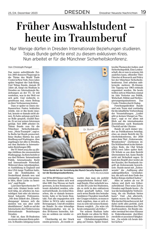 Tobias Bunde studierte Internationale Beziehungen im Bachelor-Jahrgang 2002. Nun arbeitet er für die Münchner Sicherheitskonferenz. Christoph Pegel, Journalist für die Dresdner Neuen Nachrichten, schrieb am 23. Dezember 2023 den folgenden Artikel über seinen Werdegang.