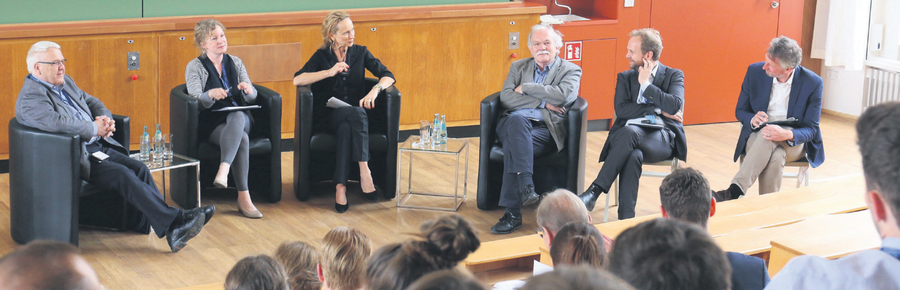 Podiumsdiskussion während der Feierlichkeiten zum 20-jährigen Jubiläum des ZIS: Prof. em. Reiner Pommerin, Prof. Anna Holzscheiter, Prof. Sabine von Schorlemer, Prof. em. Ulrich Fastenrath, Prof. Dominik Steiger und Prof. Alexander Kemnitz (v.l.n.r.).
