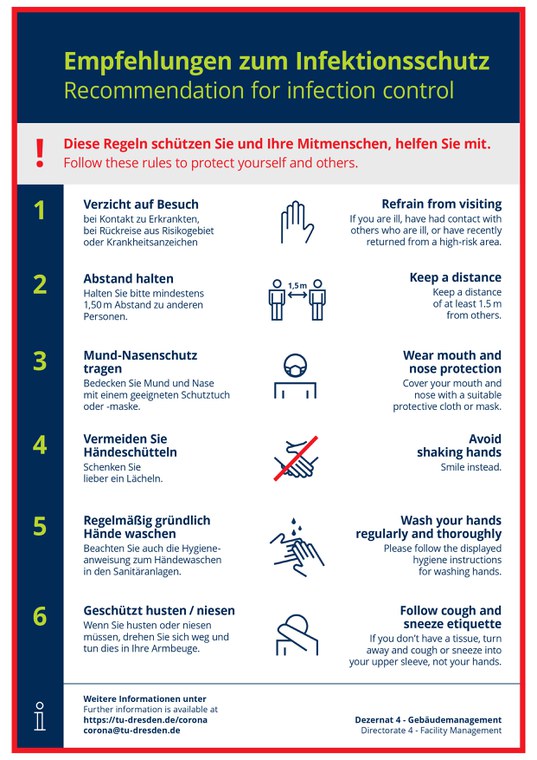 Im Wintersemester 2022/23 wird die Mehrheit der Lehrveranstaltungen in Präsenz und bei voller Belegung der Veranstaltungsräume stattfinden. Digitale oder hybride Formate können in Ausnahmefällen angeboten werden. Es gelten weiterhin die bestehenden Hygieneregeln, und das Tragen einer (FFP2-)Maske wird empfohlen. Im Fall von Verdacht auf Covid-19 sind die Kurzanleitungen des Gesundheitsmanagements zu Schnell- bzw. PCR-Tests zu befolgen. Kostenlose Bürgertests werden auf dem Campus nicht mehr angeboten.
