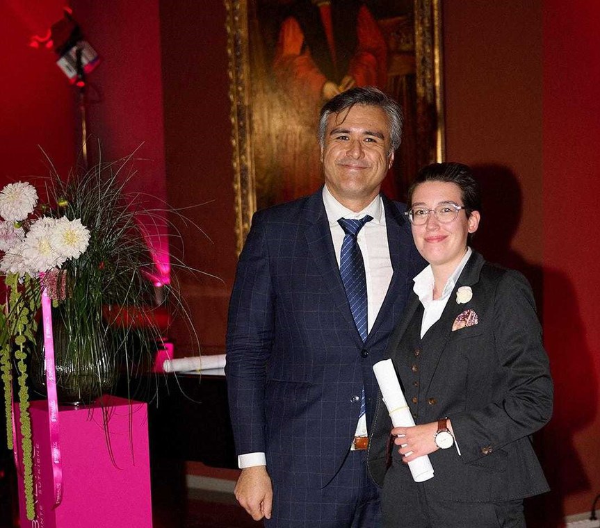 Preisträgerin Denise Köcke mit Prof. Dr. Gleider Hernandez, Präsident der ESIL und Professor an der KU Leuven