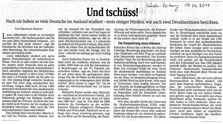 "Und tschüss!" - unter diesem Titel veröffentliche die Sächsische Zeitung am 19. Juni 2017 einen Artikel von Sebastian Martin zu deutschen Studierenden im Ausland.