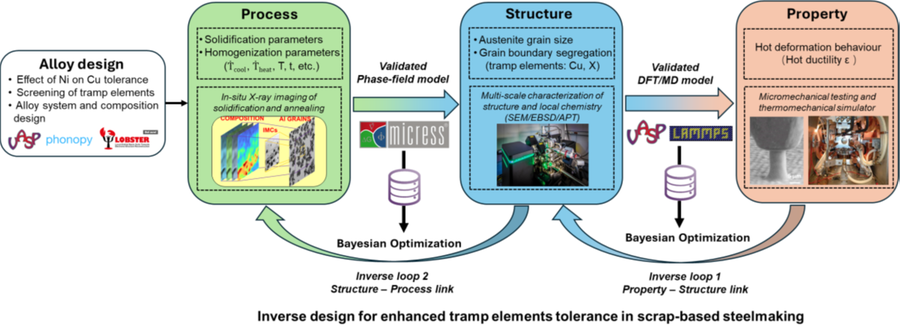 In diesem Vorschlag wollen wir eine datengetriebene Methodik entwickeln, um das Problem der schädlichen Tramp Element Segregation bei Warmumformtemperaturen zu lösen, wobei ein besonderer Fokus auf die durch Kupferkontamination verursachte „Hot Shortness“ und die Kupfersegregation an Korn¬grenzen während der schrottbasierten Stahlerzeugung gelegt wird. Durch die kombinierte Expertise aus der Materialwissenschaft für die Prozess Struktur Verknüpfung (Process Structure, PS) (Gruppe von Dr. Liotti, Universität Oxford) und der Materialmechanik für die Struktur Eigenschaft Verknüpfung (Structure Property, SP) (Gruppe von Prof. Song, Universität Kassel) streben wir an, ein umfassendes PSP Framework für Vorwärts und Invers Design zu etablieren. Der Vorwärts Halbkreis ist darauf ausgerichtet, die Toleranz zu erhöhen und die Segregation von Tramp Elementen während Erstarrungs und Homogenisationsprozessen zu steuern, sowie die Zugfestigkeit durch das Training maschinell lernender, interatomarer Potentiale zu simulieren. Der Rückwärts Halbkreis hingegen dient dem Aufbau einer inversen PSP Korrelation, die Benutzer¬anfragen entgegennimmt und vielversprechende Mikrostrukturen des Materials sowie eine Reihe von experimentellen Parametern vorschlägt, um die gewünschten Mikrostrukturen experimentell zu realisieren. Das inverse Design wird mittels eines Bayes Optimierungs Algorithmus umgesetzt. Eine Kombination aus Hoch Durchsatz Experimenten (z. B. In situ Röntgen Tomographie, mikromechanische Tests) und theoretischen Techniken (z. B. Phasen Feld Modellierung, DFT und Molekulardynamik) wird durchgeführt, um die Mikrostruktur Entwicklung, Element Segregation und die daraus resultierenden mechanischen Eigenschaften zu überwachen und zu simulieren.