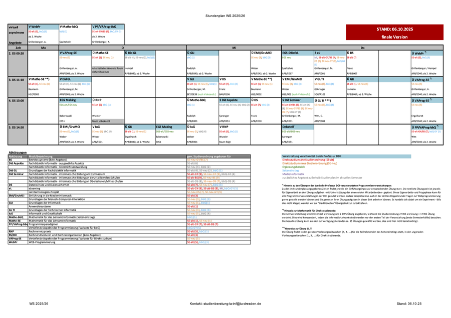 01.10.2025 Finaler Stundenplan 2025/26 [Korrektur: 06.10.2025] © TUD DDI Der finale Stundenplan für das Wintersemester 2025/2026 steht zur Verfügung. Diesen finden Sie hier.