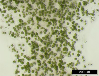 Mikroskopische Aufnahme einer Mikroalge. Felix Krujatz hat in seiner Doktorarbeit an der Fakultät Maschinenwesen ein Verfahren entwickelt, mit dem Algen gemeinsam mit anderen organischen Zelltypen 3D-gedruckt werden können.