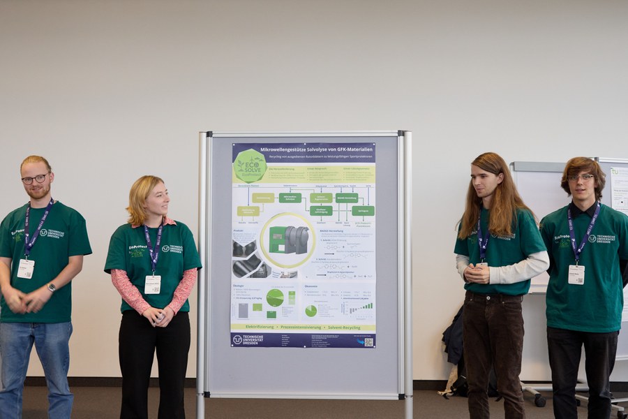 Die diesjährige Aufgabe war es, neue Verfahren zum Recycling von Rotorblättern aus glasfaserverstärktem Kunststoff zu entwickeln. Mit dem „EcoSolve“-Prozess, welcher auf einer Mikrowellen-Solvolyse basiert, überzeugten die Dresdner Studierenden die Jury durch Kreativität, Nachhaltigkeit und Wirtschaftlichkeit.