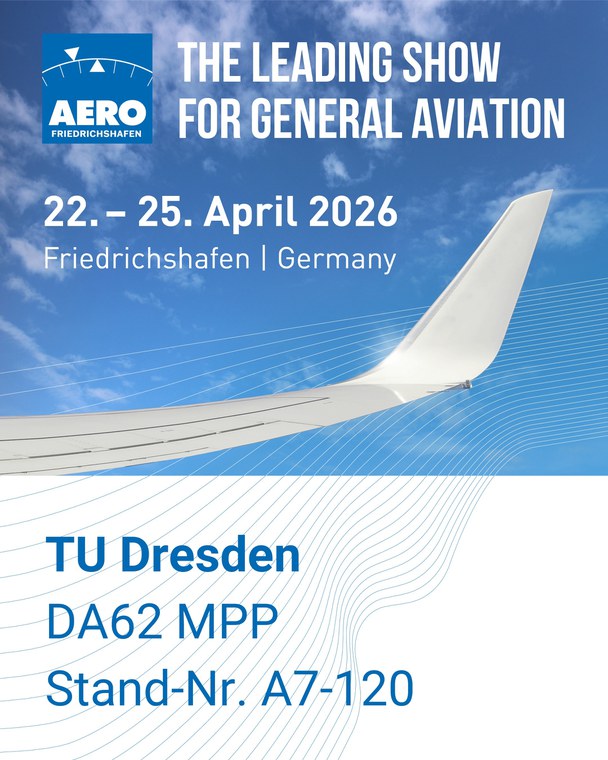 Die TU Dresden ist vom 22. bis 25. April 2026 auf der AERO in Friedrichshafen vertreten. ILR und ILK präsentieren dort ihr neues Forschungsflugzeug, die Diamond DA62 MPP, eine fliegende Versuchsplattform zur Erprobung fossilfreier Antriebssysteme und neuer Sensortechnologien unter realen Flugbedingungen. Besucher:innen können sich am Stand über das Projekt „FoFlu“ und aktuelle Forschung zur klimafreundlichen Luftfahrt informieren. Weitere Informationen finden Sie hier.