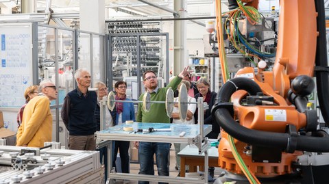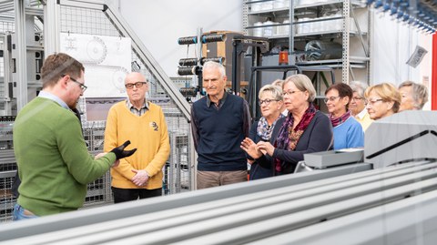 Unser Institutsdirektor Professor Chokri Cherif stellte den Teilnehmenden unser Institut und unsere aktuellen Forschungsaktivitäten am ITM in einem kurzweiligen und sehr informativen Vortrag vor. Im Anschluss wurden sie von Dr. Wolfgang Trümper, unserem wissenschaftlichen Leiter Textiltechnik, durch unsere Technika "Walter-Frenzel-Bau" und "Neue Textilmaschinenhalle" geführt. Die Alumni waren von unseren hochmodernen Textilmaschinen, Demonstratoren und aktuellen Forschungshighlights sehr begeistert, wissbegierig und interessiert.
