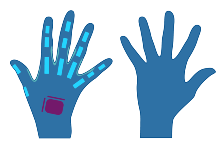 Konzeptskizze des Sensorhandschuhs bzgl. Platzierung der Sensoren und Elektronik inkl. Funkübertragungsmodule und Akku, links: Rückseite, rechts: Innenseite