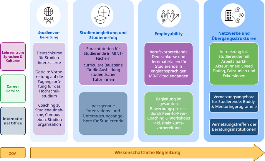 Das Lehrzentrum Sprachen und Kulturen (LSK) bei der sprachlichen Förderung der internationalen Studierenden bzw. sprachlichen Vorbereitung auf das Studium, der Career Service bei der Unterstützung zur Berufsorientierung und dem Berufseinstieg und das „International Office“, das die Aktivitäten aller Akteure unterstützt und sie mit den eigenen Beratungs- und Integrationsangeboten sowie den Aktivitäten der Taskforce internationale Fachkräftegewinnung zusammenführt.