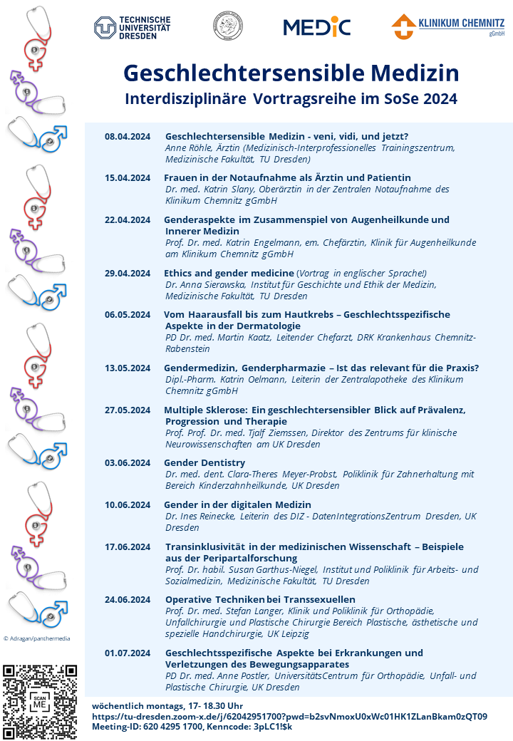 Auch im Sommersemester 2024 können Sie wieder spannende Erkenntnisse aus der Geschlechtersensiblen Medizin erfahren! Vom 08. April - 01. Juli 2024 können Sie unserer interdisziplinären Vortragsreihe immer montags ab 17 Uhr online (zoom) folgen. Wir haben wieder einen bunten Mix verschiedener Themen zusammengestellt: Diesmal sind u. a. die Notfallmedizin, Augenheilkunde, Dermatologie, Neurologie, Plastische und Unfallchirurgie und die Zahnmedizin dabei. Auch flankierende Themen wie Medizinethik, Wissenschaftlichkeit in der Medizin, Digitalisierung in der Medizin, Pharmazie bieten Einblicke in die geschlechtersensiblen Aspekte ihrer Fächer. Für Ärzt:innen ist die Reihe mit 2 Weiterbildungspunkten pro Vortrag von der SLÄK akkreditiert. Angehörige von Heilberufen können eine Teilnahmebescheinigung erhalten, um bei ihren Kammern Fortbildungspunkte zu beantragen. Auch Studierende können eine Teilnahmebescheinigung erhalten (bitte dazu im OPAL-Kurs "Geschlechtersensible Medizin" einschreiben, Hinweise auch im ePortal > Interdisziplinäre Lehrveranstaltungen) und haben die Möglichkeit, zusätzlich das zugehörige Wahlfach zu belegen. Das Programm können Sie hier herunterladen: Programm. Um am Zoom-Meeting teilzunehmen, nutzen Sie bitte diesen Link: https://tu-dresden.zoom-x.de/j/62042951700?pwd=b2svNmoxU0xWc01HK1ZLanBkam0zQT09
