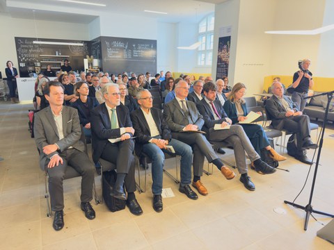 Ausstellungseröffnung mit (v.l.) Janko Haft, Kaufmänischer Vorstand UKD, Prof. Fred Zepp, Präsident DGKJ, Prof. Reinhard Berner, Direktor Klinik und Poliklinik Kinder- und Jugendmedizin UKD, Dr. Erik Bodendiek, Präsident Sächs. Landesärztekammer, Prof. Florian Bruns, TUD, Bürgermeisterin Annekatrin Klepsch und Prof. Thomas Beddies, Medizinhistoriker.